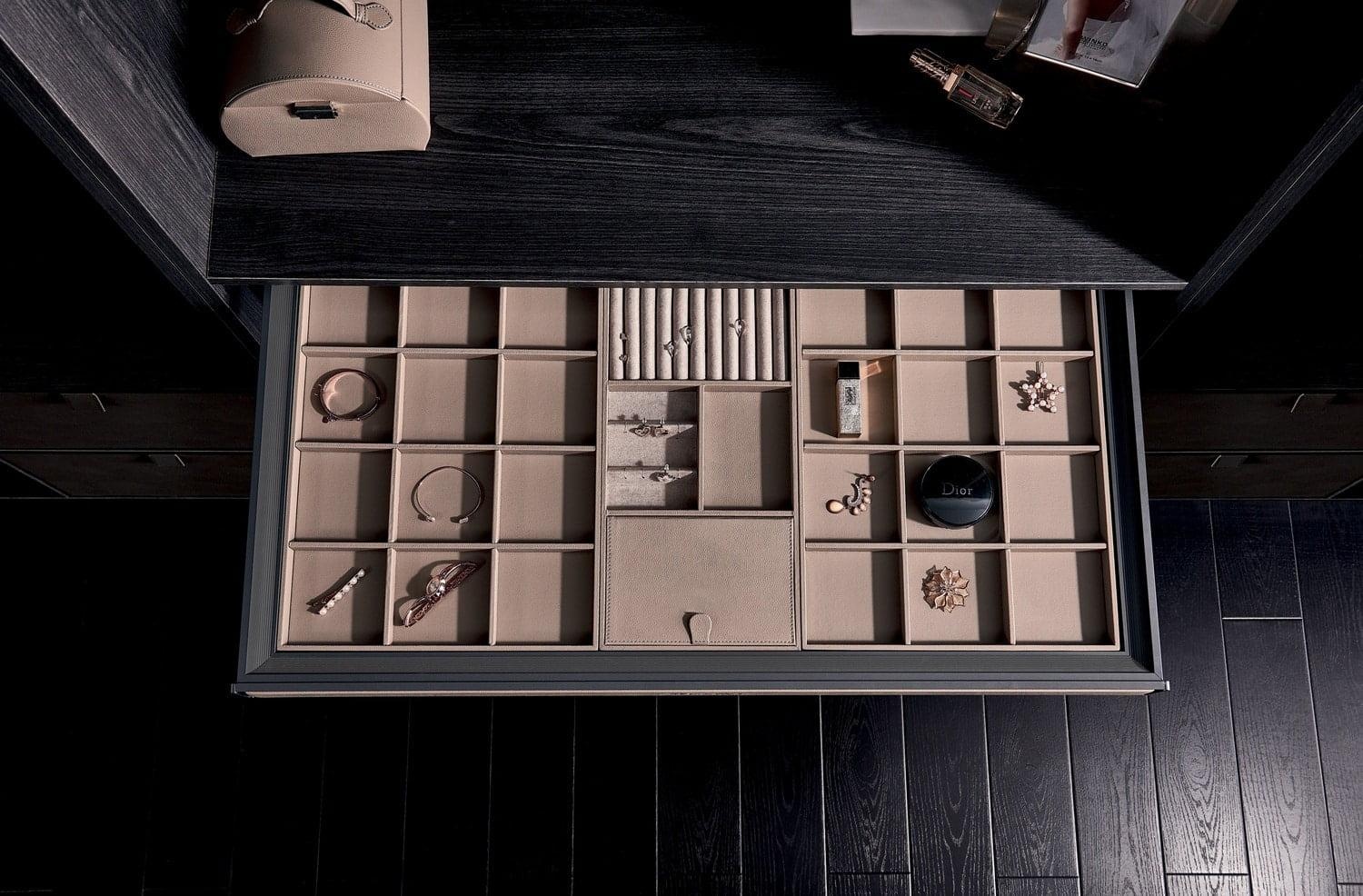 Purpose-made holders fit perfectly within elegant thick drawer inserts, available in various finishes.